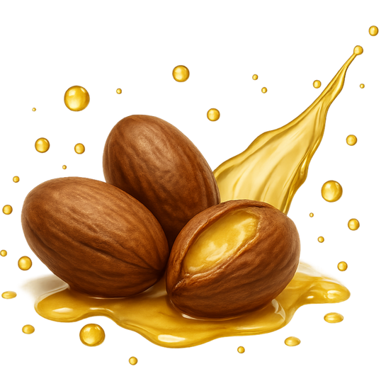 Realistic almonds with golden glossy liquid around it like its being splashed on them from behind, oil droplets glowing around them, macro beauty ad style,  luxury skincare aesthetic on transparent background